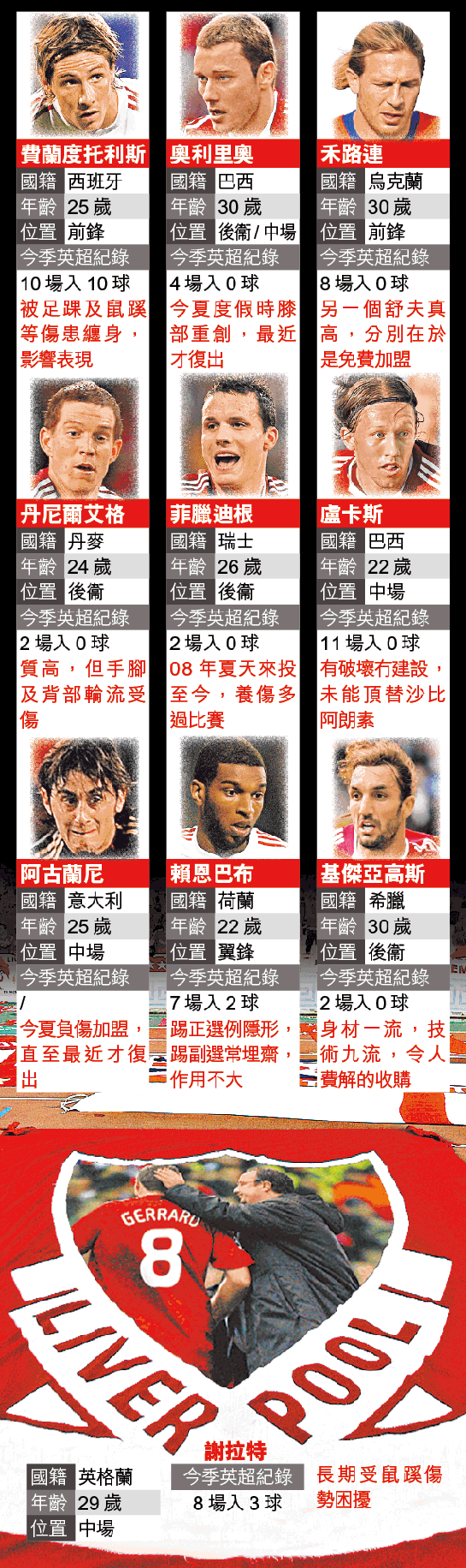 另外,利物浦有太多容易受傷的男人,丹尼爾艾格及菲臘迪根可說是當中的佼佼者,來投後養傷時間遠比比賽時間多。至於謝拉特及費蘭度托利斯確是世界級,可是同樣長時間被傷患纏身。問題是紅軍沒有球員能替補他們的位置,若二人無法披甲,球隊猶如廢了一半武功。