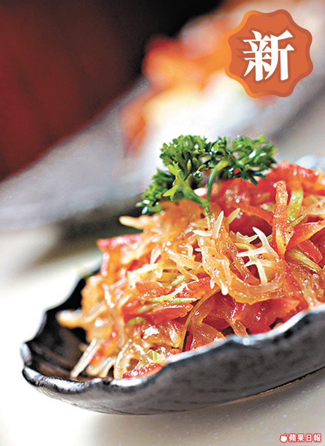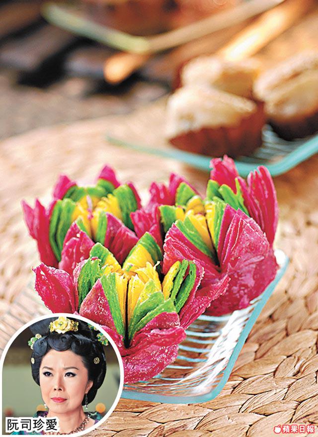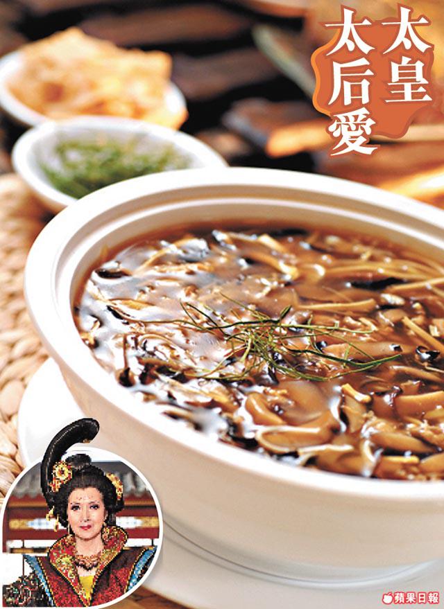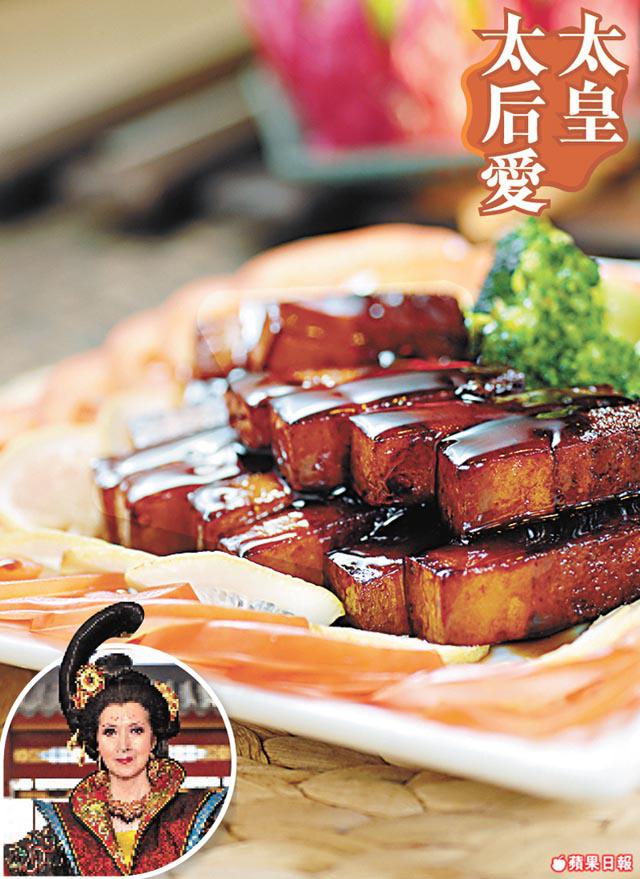 愛吃素的心姐經常到黃大仙百好素食,上星期「皇上妃嬪」便齊到此預祝太皇太后生日。餐廳主打粵菜點心,其中的牡丹酥更曾在《宮》劇出現過,光王原來最愛吃這裏的黑松露桂花翅,果然不笨。心姐則鍾情紅燒東坡肉和太史五蛇羮,記者看東坡肉果真做到晶瑩通透,師傅先烘過大豆,加果皮、黨參、羅漢果做上湯,之後把壓碎的腐皮浸過上湯,繼而加蒟蒻做皮模仿肥膏,然後再壓並雪起,最後再浸上湯便成。味道酸甜因淋了醋,腐皮像結實的扣肉,連蒟蒻一起吃,似足肥豬肉味。