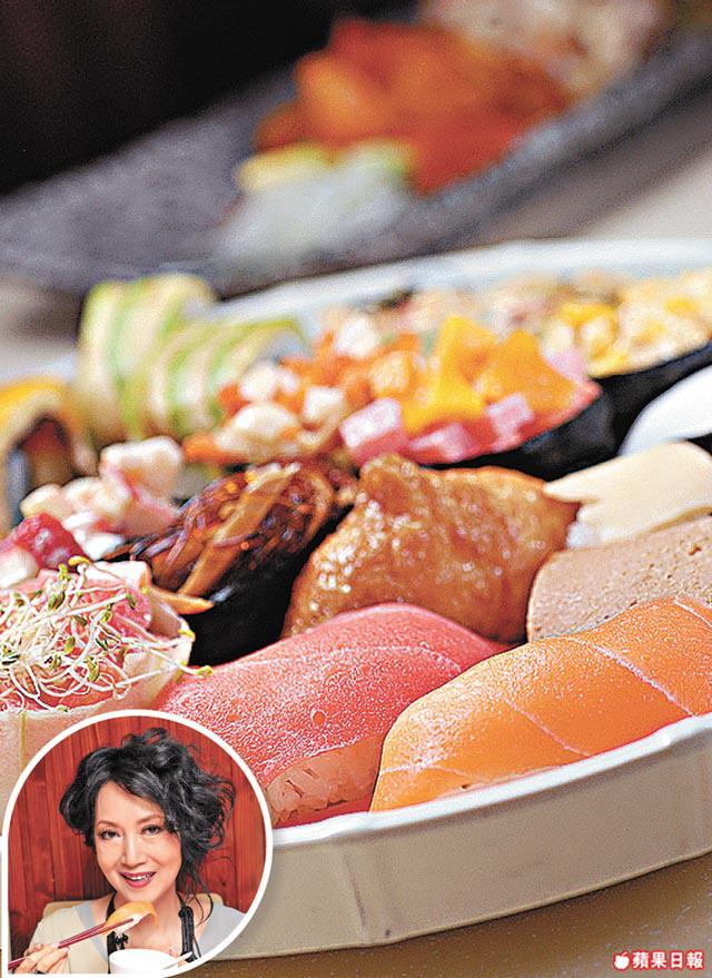 為演《宮》,穿戴至愛的豪華古裝戲服,心姐狂食增磅,由102增至115磅,愛吃日本料理的她這天到了陳志雲常來的素菜館,餐廳賣點是以假亂真的刺身壽司。吃壽司,老闆建議要點wasabi吃,果然像真度有八成。心姐跟記者都覺得全因那豉油和wasabi,令用蒟蒻做的三文魚、吞拿魚等刺身有一份鮮味。心姐還建議吃第二件壽司時,先吃些伴碟的薑片,用來清一清味蕾才能嚐真第二件食物。聽到心姐大讚,老闆不禁說:「你的兒子經常來吃。」說的原來是在《巾幗》演她忤逆子的敖嘉年。