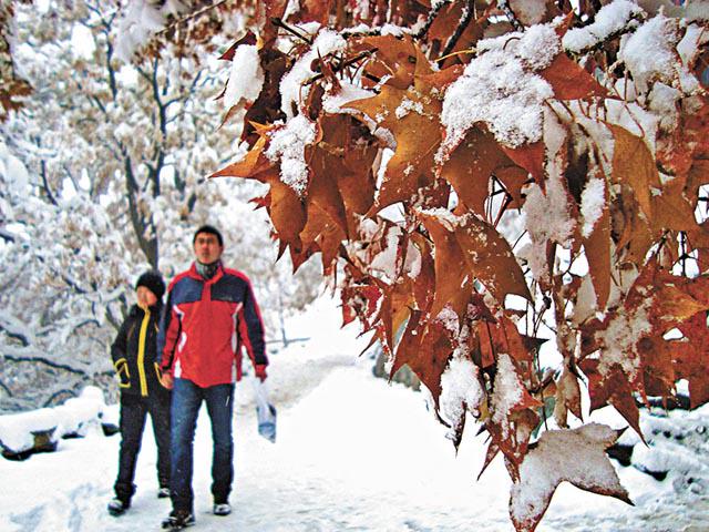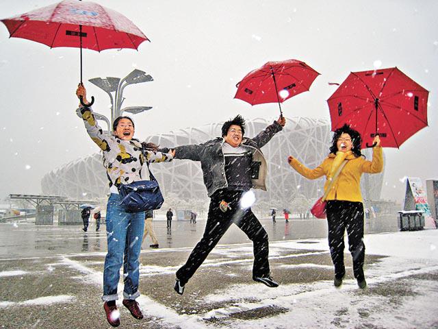 昨日早上,京城市民一覺醒來發現,屋頂、樹梢和路面積上一層厚厚白雪,天空雪花飄飄,滿城銀妝素裹。入冬前的第一場雪令市民和遊客無不興奮,雖然氣溫低至-3℃,但不少市民、遊客紛紛走到街上玩雪。北京各大旅遊景點,賞雪玩雪成為遊客們一項臨時節目。