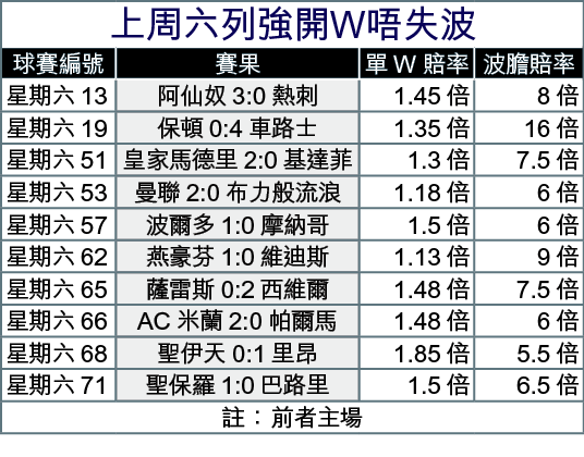 列強開熱W這條筍極盤路,由英超早場阿仙奴揭序幕,兵工廠先以3:0淨勝熱刺,連稍後的車路士亦大勝保頓4:0,復至夜場的曼聯同樣淨勝布力般2:0,全部保持0失球。英超如是,荷甲的燕豪芬、法甲的波爾多與里昂、甚至清晨時份的巴甲勁旅聖保羅亦然,全以1:0小勝波膽終結。