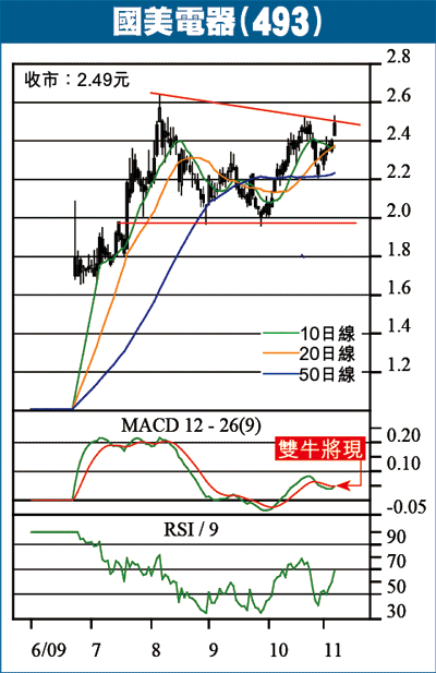 內需股中的國美電器(493),走勢已屆突破邊緣,特別值得留意。國美停牌7個月後,於今年6月復牌,8月初升至2.64元高位,其後以三角形整固,上周五蓄勢上破三角形降軌2.50元,一旦確認上破,量度升幅目標可達3.10元。