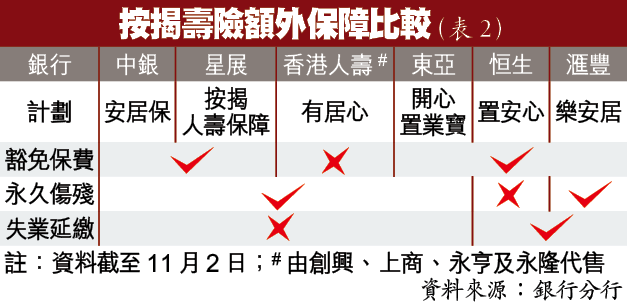 按揭壽險除有身故賠償,亦附加傷殘豁免保費和完全及永久傷殘保障(表2),但條款各有不同,除香港人壽「有居心」計劃沒豁免保費保障,其餘承保商均指,於受保人60歲或65歲前連續傷殘半年,可豁免其後保費,滙豐、恒生及東亞更可退還該半年保費。