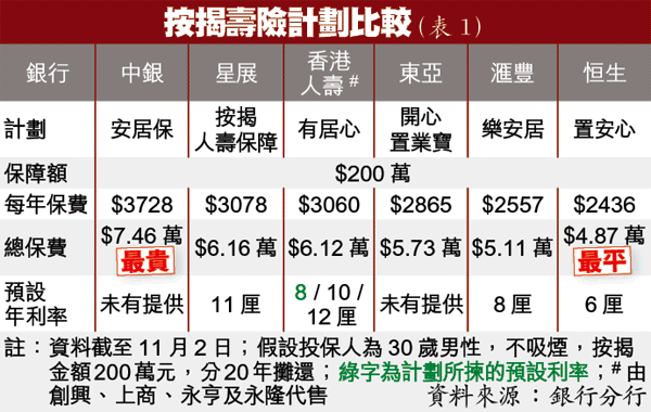 比較各銀行提供的按揭壽險計劃,假設投保人為30歲非吸煙男性,身體狀況良好,按揭金額200萬元,分20年攤還,保費以恒生「置開心」最低,年保費2436元。最貴為中銀「安居保」,年繳3728元,兩者相差1292元,供足20年,恒生較中銀慳約2.58萬元(表1)。