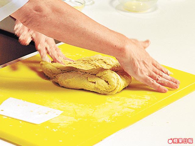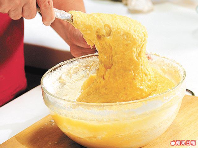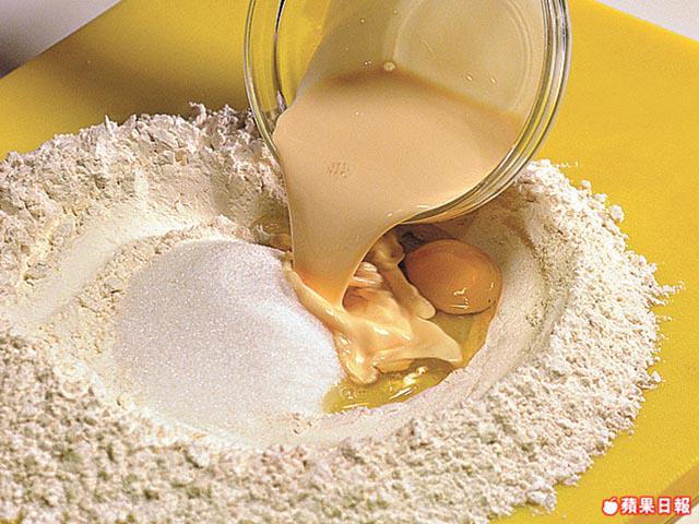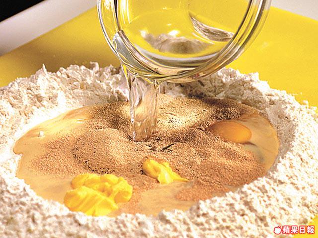 1.高筋麪粉堆放枱面開個窿,加糖、雞蛋、淡奶、牛油、酵母及水,搓成麪糰,蓋上毛巾待發半小時。