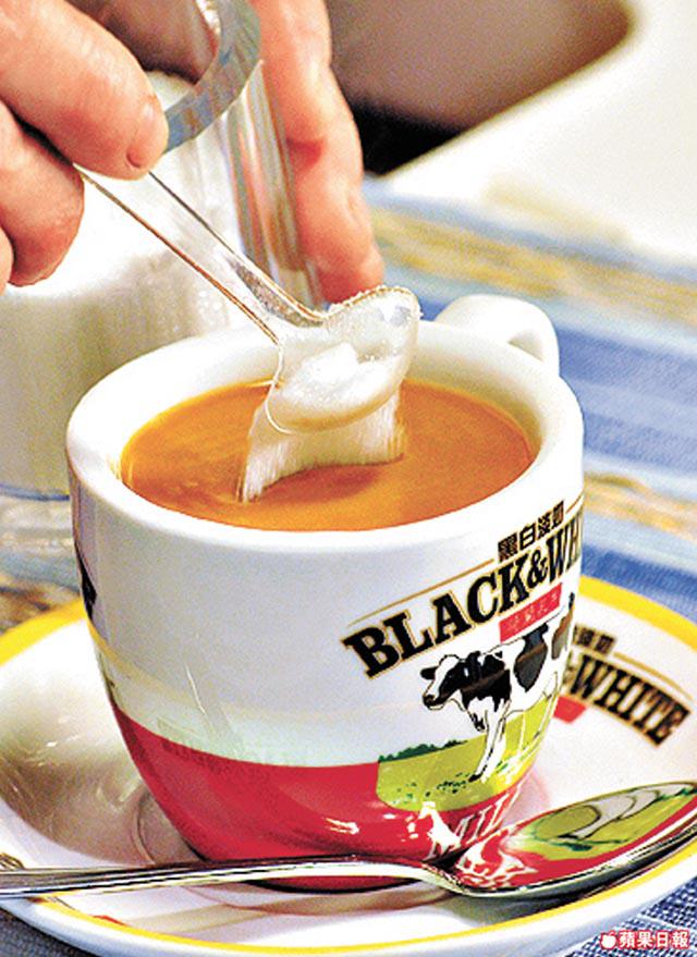 3.在杯內加3湯匙淡奶,倒入三分一咖啡及三分一紅茶,然後加適量砂糖調味即可。