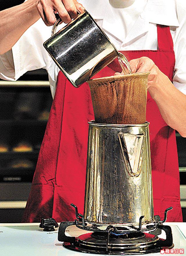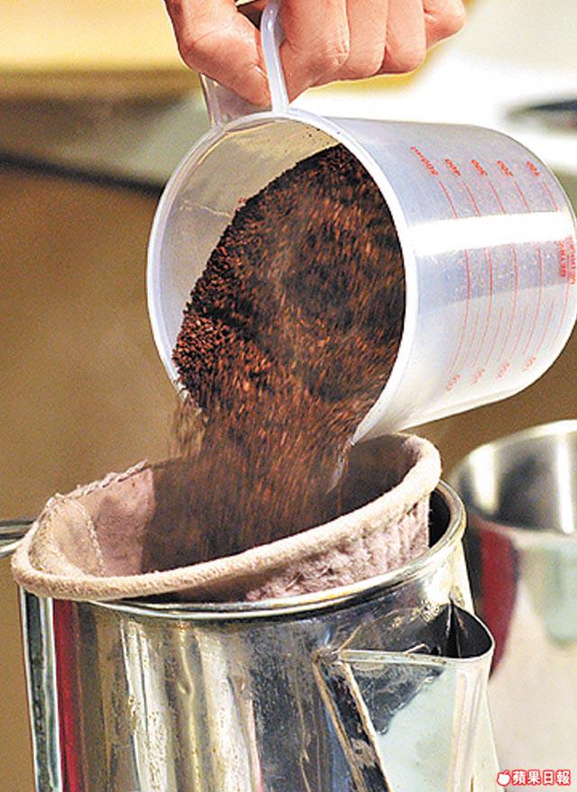 1.將咖啡粉倒入尖嘴壺中的布濾網內,然後撞入滾水至八成滿,開大火煮至滾起,轉細火,將布濾網拿起,將咖啡經布濾網倒入另一壺中,將布濾網套回尖嘴壺,將咖啡倒入尖嘴壺,繼續用細火煮15分鐘,然後反覆倒進茶壺3次。