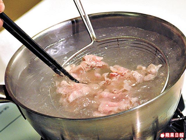 2.另燒熱一鍋水,放入熟米線用大火灼一灼,盛起放碗中。肥牛肉片亦放入煲用大火灼一灼,然後放米線上,最後撒上葱花即成。