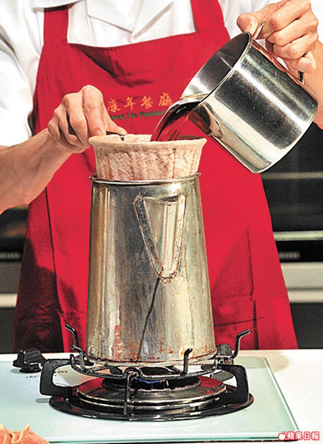 2.將紅茶葉倒入尖嘴壺中的布濾網內,撞入滾水至八成滿,開大火煮至滾起,轉細火,將布濾網拿起,將紅茶經布濾網倒入另一壺中,將布濾網套回尖嘴壺,將紅茶倒入尖嘴壺,繼續以細火煮15分鐘,然後反覆倒進茶壺3次,是為「撞茶」。
