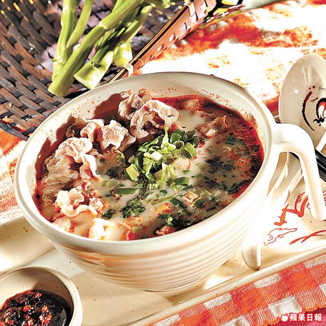鮮魚湯400毫升、麻辣醬2茶匙、淡奶1湯匙、熟米線4両、肥牛肉片6片、葱花適量
