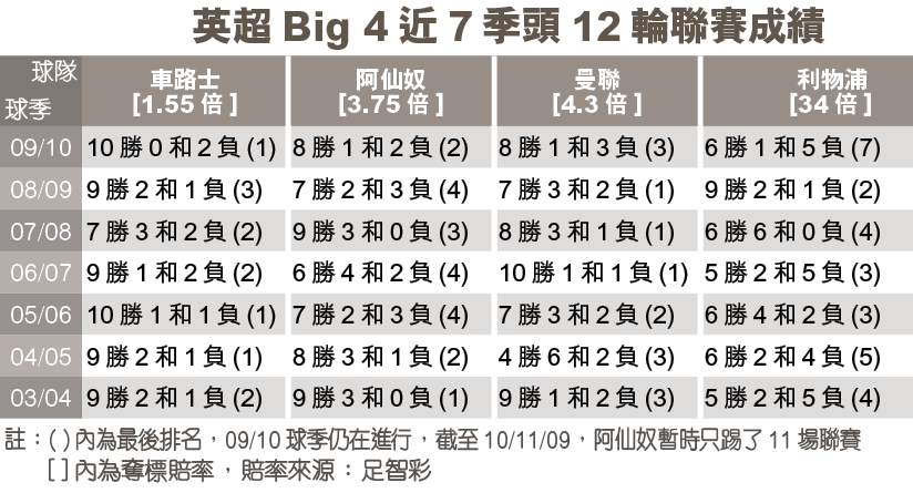 雖然賓尼迪斯對前路仍抱樂觀態度,但翻看近季英超紀錄,要是利物浦在頭12場聯賽輸多過4場或以上,最後的輸波場數都是達雙位,而且有兩次是未能入三甲。他們今季的表現確是令人失望,更比車路士、阿仙奴及曼聯比下去,令人相信英超要改朝換代,由Big4變成Big3。與此同時,榜首車路士的隊長泰利日前卻表示,要是他們可於聖誕節帶出,就大有機會帶返終點。他說:「現階段難以估計哪隊可成為冠軍,但要是我們在12月前有5分優勢,前路便一片光明。」