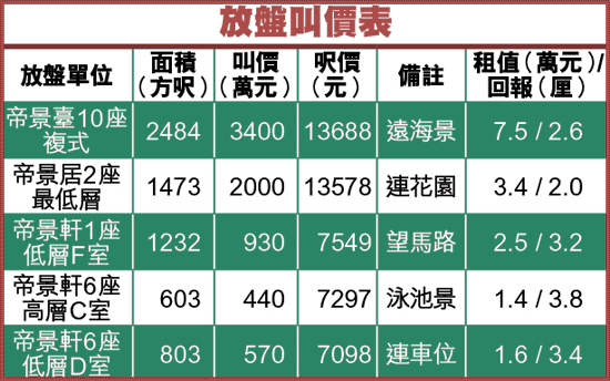 介紹的帝景軒3房戶面積1297方呎,座落中層向外圍馬路,傳來行車聲浪,幸座向東南,視野亦算開揚。單位每方呎開價不足9000元,較市價逾1萬元水平略低。