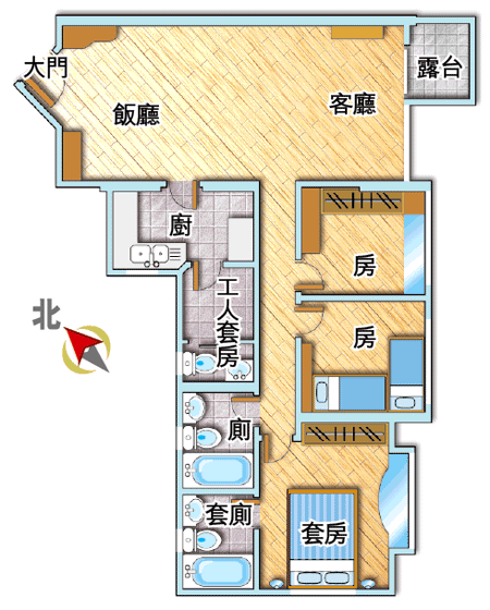 間隔:3房(1套)2廳;另工人套房及露台