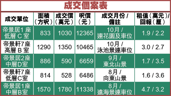 美聯物業太子道西分行資料顯示,現時帝景峰放售單位約100個,開放式單位入場費440萬元。屋苑成交量不算高,平均每月交投約2至3宗。近期成交平均呎價逾1萬元,已重返去年高峰水平。租金方面,一般山景單位呎租約20元,內園景單位呎租約23元,享遠海單位呎租最貴,可達30元。