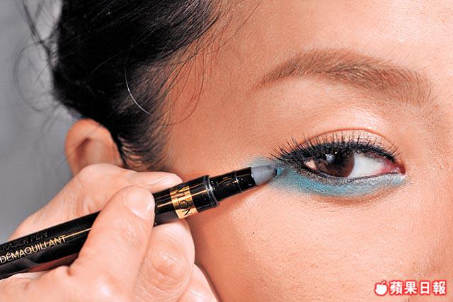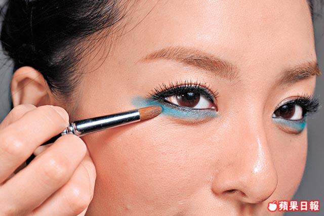 2.由下眼角順住方向往後掃上藍眼影,萬一出了界,可用這種改錯筆修正,一塗便可把原來眼影推走。