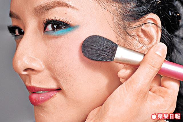 3.胭脂要淡,只由蘋果位往髮際稍為掃上帶啡胭脂,基本修飾輪廓。