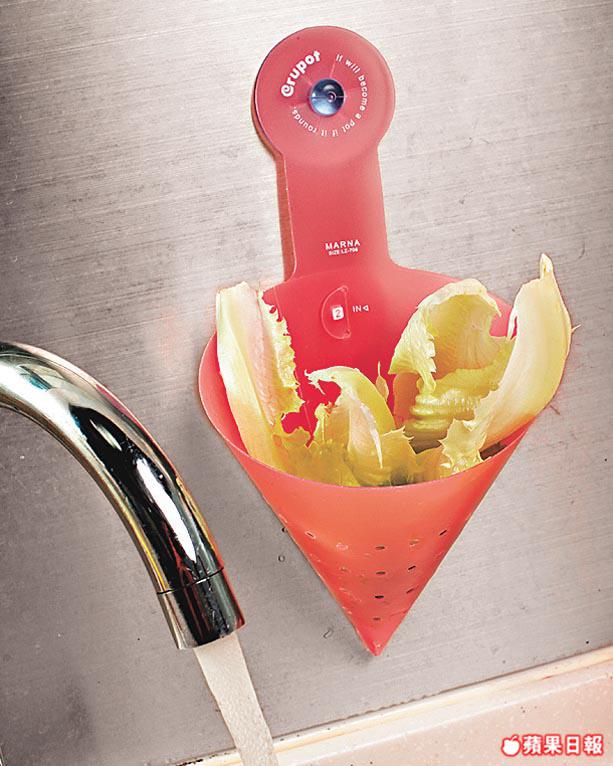 說到洗菜隔水工具當然不少得傳統的小籃子,然而,小籃子雖同樣可隔蔬菜多餘水份,但時間就較一按即轉的旋轉隔水盆長一點。可傳統小籃子亦不斷推陳出新,就如賣HOME最新引入一張通孔膠片,用家只需將膠片輕輕一捲,便成倒三角掛牆小籃,方便慳位!