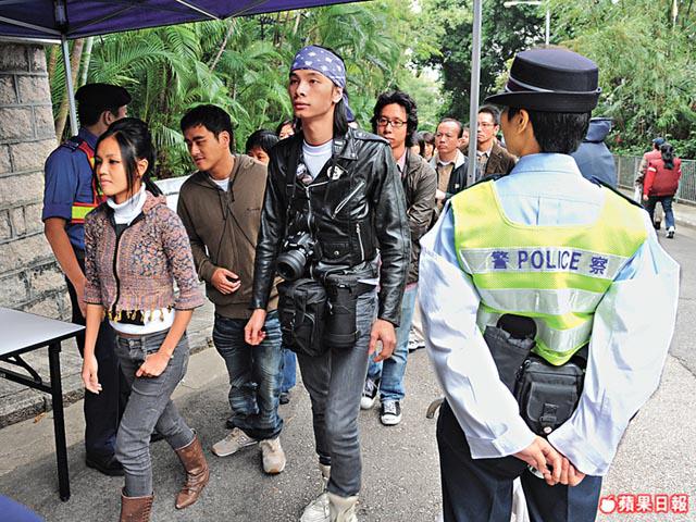 禮賓府昨日舉行開放日,30名網民自發「踩場」,每人身穿一件寫有一個單字的衣服,以外套遮蓋然後排隊入場。雖然在場警察已認出他們早前曾到禮賓府外示威,並與警方發生衝突,但依然如常放行,惟派出便衣探員一直密切監視,不時以對講機通報他們的蹤迹。