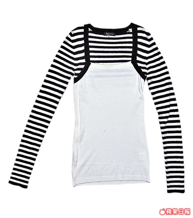 OnAya(左):titty&Co.白色毛毛背心$819、titty&Co.藍白黑直紋背心$679、titty&Co.黑色大金扣Belt$519