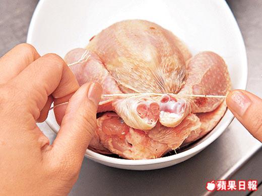 4. 用少許鹽抹勻春雞內外,將(3)釀入春雞後,用繩將雞尾與雙腿紮實。