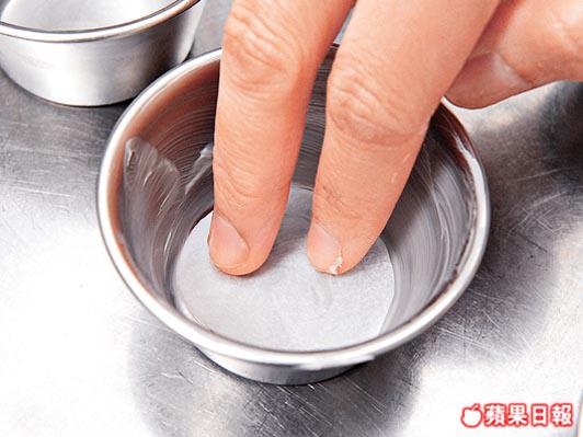 2. 於杯模內平均塗抹少許牛油,然後放入牛油紙墊底。