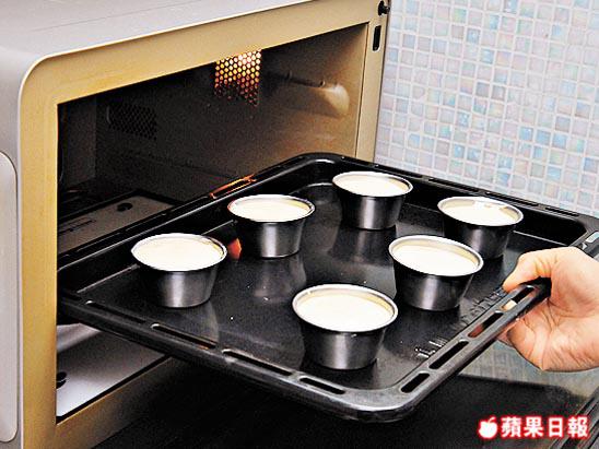5. 將(4)平均倒入杯模中,放入焗爐,用180℃焗15分鐘,取出後脫模。