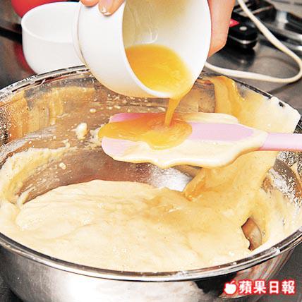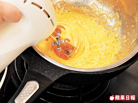 3. 糖加雞蛋拌勻,打起成幼細滑溜的泡沫狀。