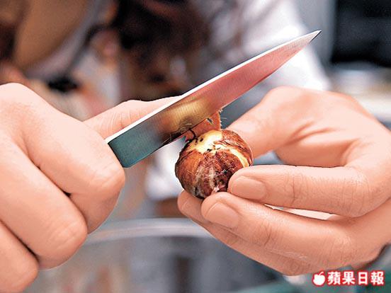 刀削法:將栗子浸入熱水約10分鐘,撈起即可用刀仔輕易挑開栗子衣。