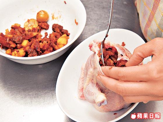 用栗子、蘋果及麪包碎炒成的餡料,吸收雞油精華後,依然乾爽不油膩,食落還很惹味!雞肉焗得皮脆肉嫩,更帶淡淡果甜。