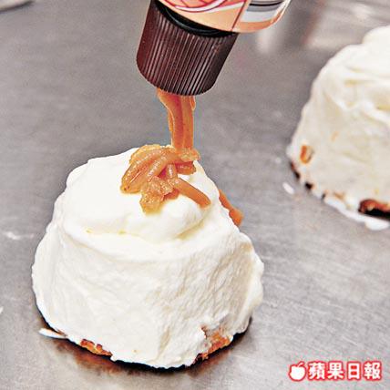 7. 忌廉加糖後打起,平均塗抹在(6)上,最後在面層會唧上栗子茸即成。