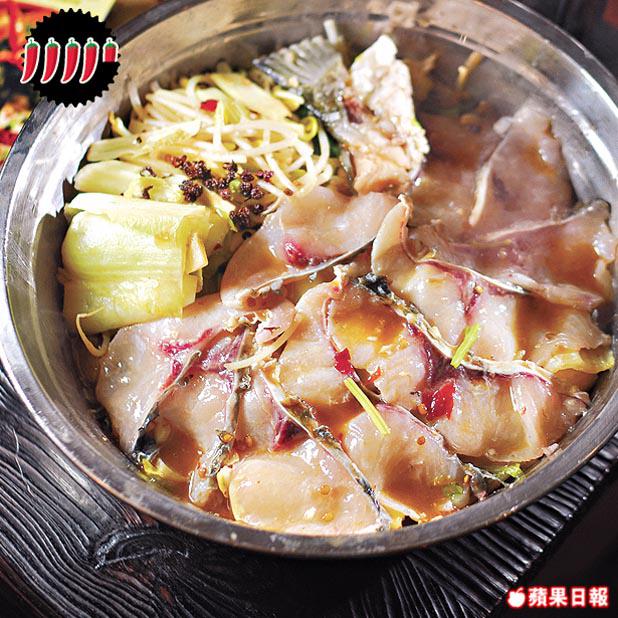 以大塊鯇魚片作料,底下有紹菜、大豆芽等蔬菜,吸盡辣湯味道。