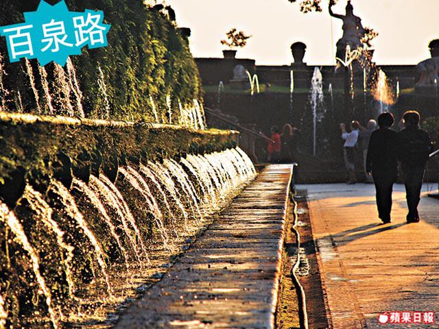 別墅對出花園中央,上中下層各有一座噴泉,遠看像天然管風琴!最上層的管風琴噴泉從早上十點半起,每兩小時會奏樂,關館前四點半是最後一場。一瞥手錶還剩兩分鐘,立刻跑上去。到達時,看見噴泉依舊,水簾中央傳來微弱管風琴聲,尚未聽清已曲終人散,就此而已當場O嘴!可能受香港商場音樂噴泉洗腦,總以為泉水必射來射去。完場後在百泉路閒逛,黃昏橘光把泉水染成金光,害我趴在泉邊拍了半小時還意猶未盡。