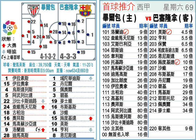 西甲榜首球隊巴塞隆拿,周六作客北部雄師畢爾包;考慮巴塞有首席射手伊巴謙莫域受傷,又要兼顧歐聯大戰,博巴塞小勝而回,取「讓球主客和」「和局」。(球賽編號:星期六69;now634及660台明日5:00am直播)