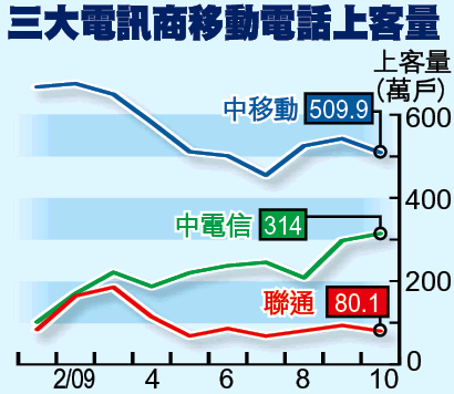 另外,中電信(728)公佈10月份CDMA用戶上客314萬名,較9月份的297萬名增加17萬,再創今年新高。今年至10月底,中電信CDMA用戶達4992萬戶,今年累計淨增長2201萬名。固網電話用戶於10月底為1.9293億戶,按月流失146萬戶。固網寬帶用戶達5215萬戶,10月淨增70萬。