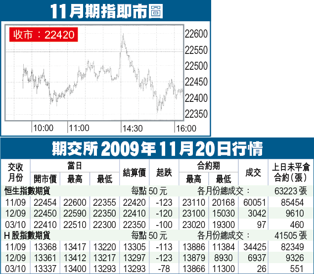 期指承接外圍弱勢低開,持續尋底,但未見太大沽壓,以22420收市,跌123點,低水35點,成交合約6萬張。