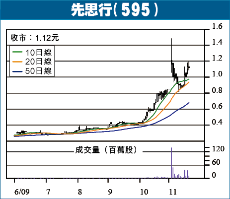 月初,先思行(595)配售新股,集資用於發展LED業務,而承配人包括李澤楷及惠理集團,引起市場憧憬,11月4日復牌當日一度高見1.48元,較停牌前升74%,其後急跌數天,已打回原形,周四公佈業績,又再策動攻勢。