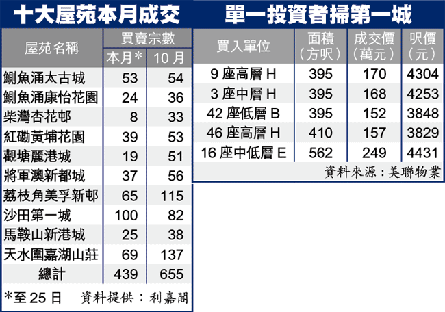 此外,上月有137宗成交的天水圍嘉湖山莊,據中原地產高級區域經理郭佩玲稱,因業主叫價強硬,買家入市意欲減,本月成交較上月同期急跌逾30%。