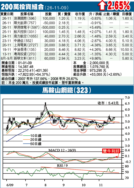 恒指昨挫近1.8%,H指更跌逾2.2%,馬鞍山鋼鐵(323)相對硬淨,微跌2仙,收報5.43元。日線圖上看,馬鋼今年8月開始營造複式頭肩底,頸線於上周初升破,並已完成後抽,回復升勢,以升破頭肩底計,量度升幅目標可達6.20元,現水平買入,值博率頗高。