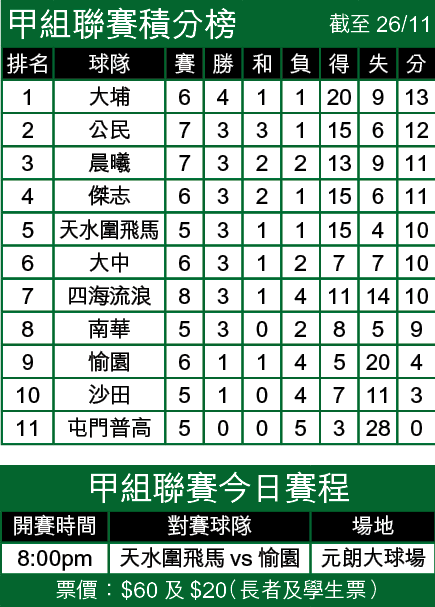 以5戰10分排第5位的天水圍,上仗主場與公民踢成1:1,痛失兩分,但表現並非太差,惟球隊高層對球隊演出並不滿意,相信球隊此戰遇上目前排尾第9位的愉園,必定會打醒十二分精神,務求全取3分繼續追趕前列球隊。