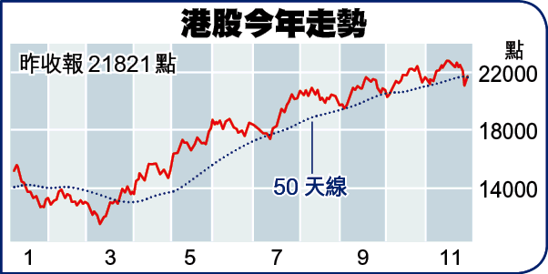 恒指上周五失守50天線(現處21814點),昨極速成功收回,滙業財經研究部主管熊麗萍預期,恒指如能企穩50天線樓上,年底前有望延續升浪挑戰二萬三。事實上,今年7月及10月,恒指曾兩度跌穿50天線,無獨有偶,翌日恒指同樣大反彈,重新收回其上,然後維持一浪高於一浪走勢。