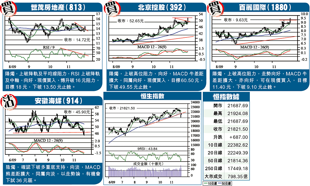 港股大幅反彈,恒指高開之後,大部份時間在50日線(21814)區徘徊,收報21821,升687點,成交減至798億元。12月期指收報21748,升561點,轉低水73點,成交8萬多張。