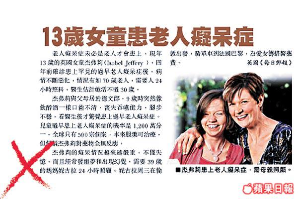 有報道指英國某4歲男童,被診斷患上全英國只有20個病例的「兒童版老人癡呆症」,亦即尼曼匹克症(Niemann-Pick),無藥可醫;英國《太陽報》亦報道,一個13歲女童出現喪失記憶、口齒不清、容易迷失方向等老年人才有的病徵,郭教授解釋:「老人癡呆只是症狀,除阿氏癡呆(Alzheimer'sDisease)、腦血管閉塞、柏金遜症外,世界上還有某些對腦部造成創傷的罕見遺傳病,症狀類似老人癡呆,不能說有年輕化趨勢。」