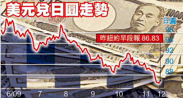 日圓兌每美元過去7個月累升14.52%,上周五更升見84.83日圓的14年新高,日本出口商備受強日圓煎熬,當地車廠一哥豐田汽車便預計,美元兌日圓每貶值1日圓,經營溢利便減少300億日圓。市場原預期央行會在會議上討論壓抑日圓升值的措施,惟結果隻字不提,美元兌日圓雖一度升見87.53,但於紐約早段一度回落至86.83,倒跌0.25日圓。