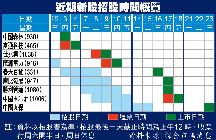 另市場消息稱,明日起招股的春天百貨(331),招股價介乎1.65至2元,發售15億股,集資最多30億元,按明年預測盈利計,預測市盈率介乎16至19倍。發售股份中5億股來自大股東、即同為寶姿(589)大股東陳氏家族,最多套現約10億元。