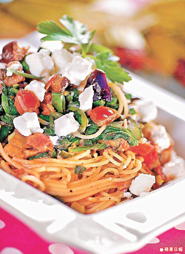 意粉150克、特級初榨橄欖油6湯匙、蒜頭4粒(切碎)、葱4條(切段)、番茄3個(切粒)、茄子1條、意大利青瓜1條(切粒)、菠菜500克、希臘白軟乾酪200克、乾牛荎1湯匙、鹽/胡椒粉各適量
