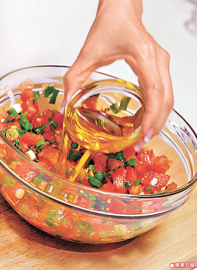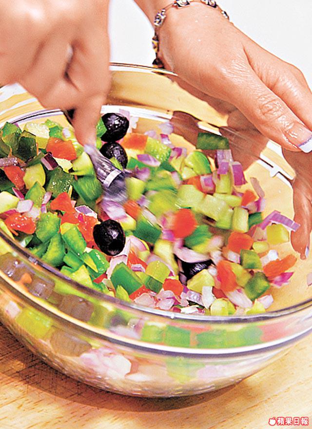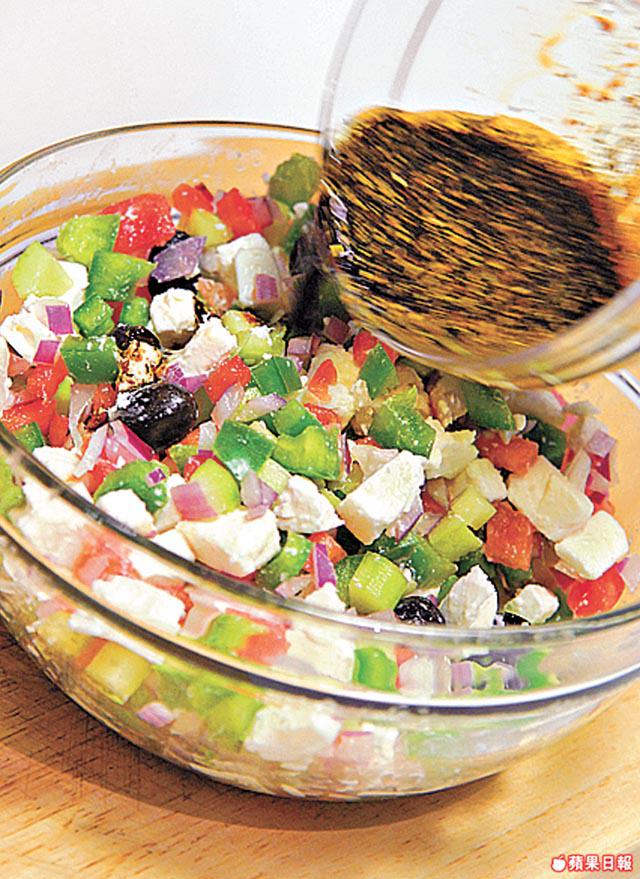 4.將番茄、蒜粒、葱段、乾牛荎、3湯匙特級初榨橄欖油及半份希臘白軟乾酪拌勻,加鹽調味成汁料。