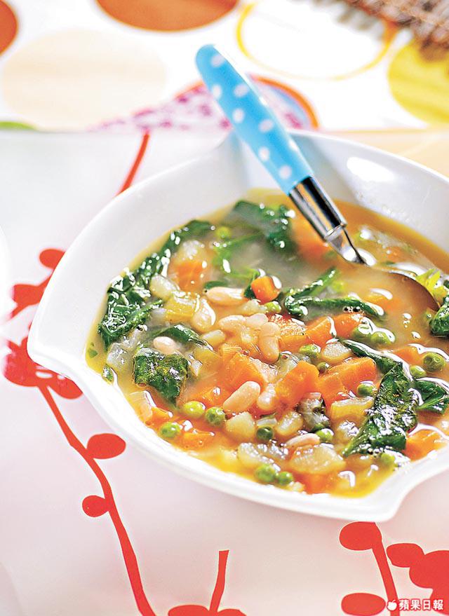 洋葱1個(切粒)、紅蘿蔔1條(切粒)、西芹1條(切粒)、蒜頭1粒(切粒)、薯仔1個(去皮切粒)、雞湯6杯、特級初榨橄欖油3湯匙、新鮮芫荽2茶匙、白腰豆420克(浸過夜)、菠菜300克、青豆2杯、鹽1茶匙、黑胡椒2茶匙
