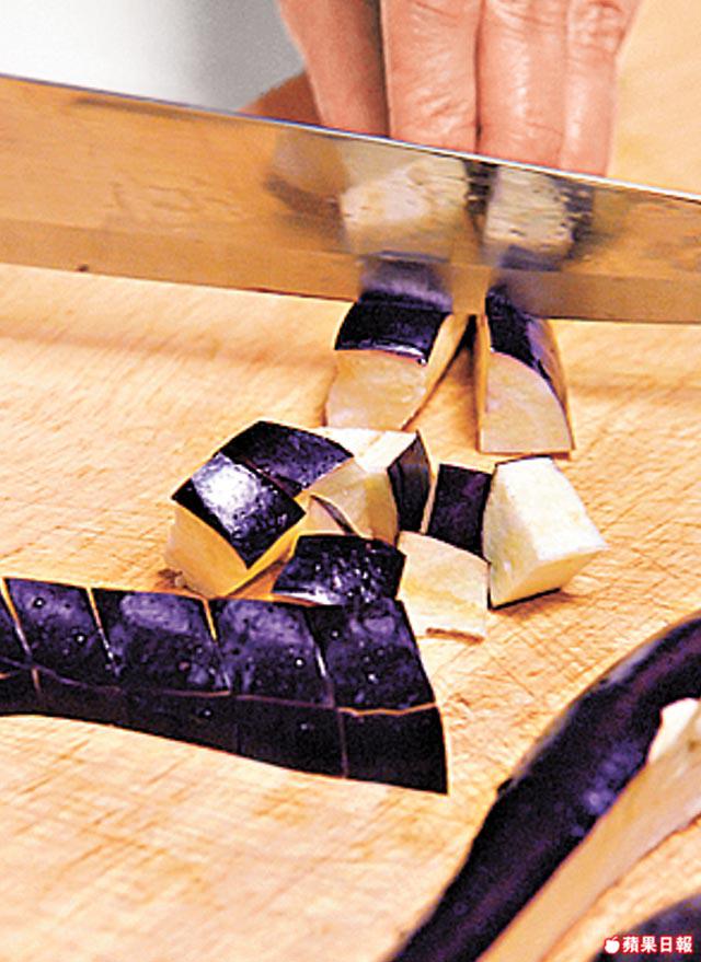 2.茄子去蒂後,切半再切成粒。燒熱鑊下1湯匙橄欖油,用中小火炒茄子粒至表面微黃後盛起。