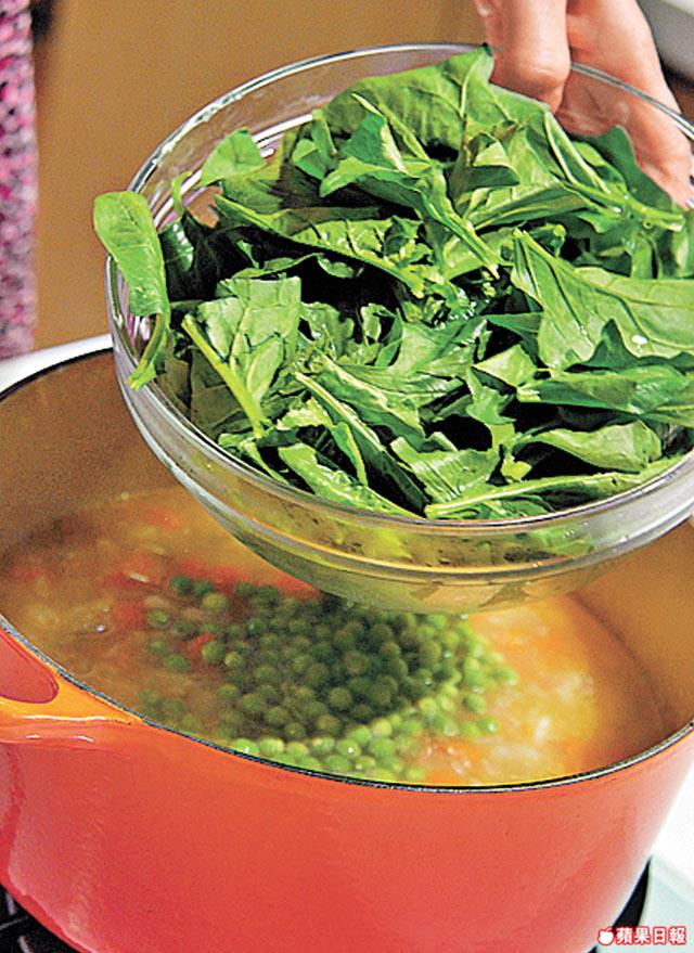 3.再加青豆、菠菜、黑胡椒及鹽煮至再滾,約煮3分鐘,最後加芫荽及剩餘的特級初榨橄欖油拌勻即可上碟。