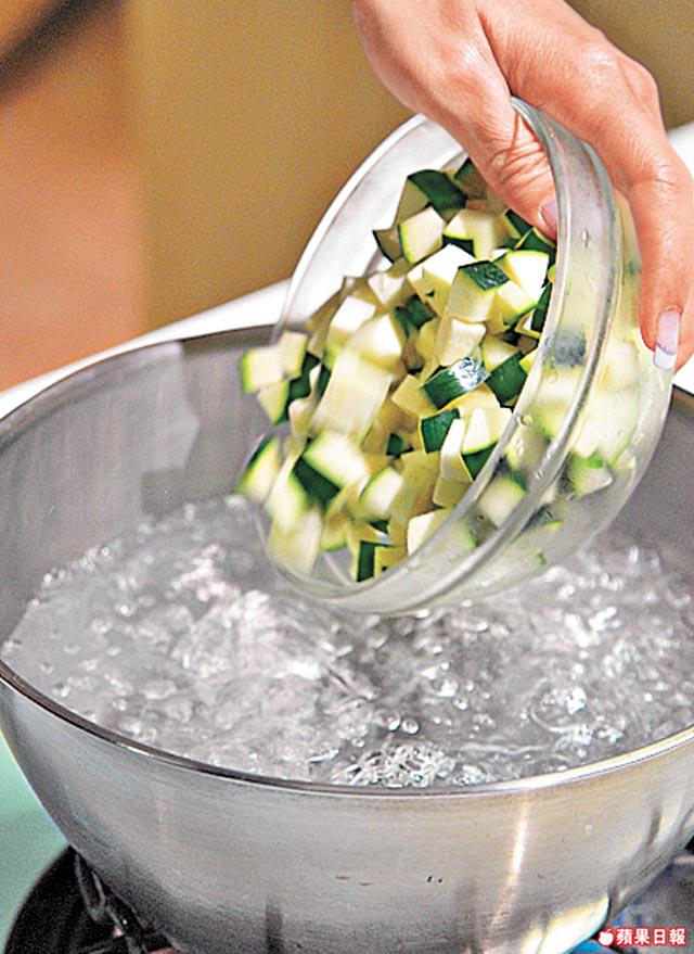 3.燒滾一鍋水,放入意大利青瓜粒烚2分鐘後盛起。菠菜亦放入滾水略灼至軟身後盛起。
